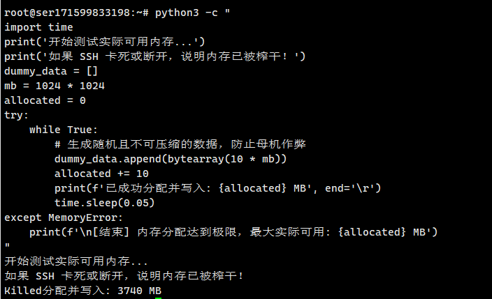 print(f'\n[结束] 内存分配达到极限,最大实际可用: {allocated} MB')