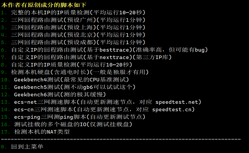 这篇文章发一下我目前测评VPS的一些常用脚本,我个人认为每个类型的有一样就够用了,比如说测试硬件的话,你就没有必要整特别多个,一个就够用了。每个脚本我会发github仓库地址和一键脚本
