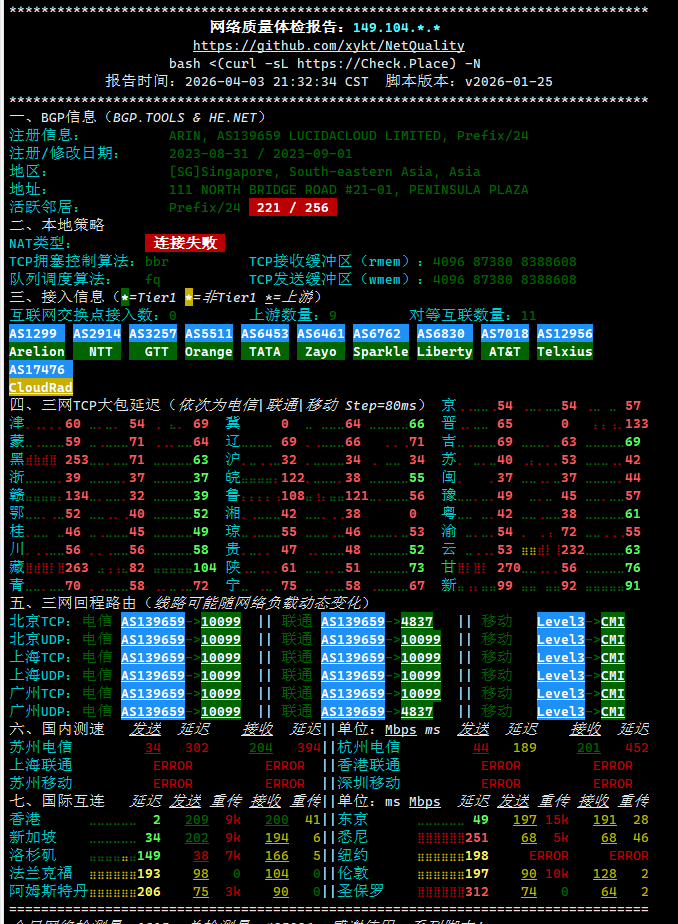 检测内容包括BGP信息,接入信息,三网TCP延迟,三网回程路由(注意这个脚本检测出来nodata无数据),国内测速,国际互联。