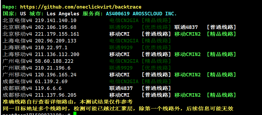 1.虽然脚本说除第一个线路外,后续信息可能无效,但是我发现移动CMIN2会被排到后面,实际上我看了详细路由它跨海确实是CMIN2,估计是这个机器移动在美国海关机房里第一跳的ip刚好是CMI,紧接着同机房内迅速切为CMIN2。大家参考的话可以看第一个或者着重留意看标精品线路的那一个就可以,那个基本上就是跨海线路。