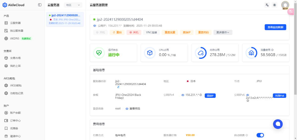 大家好啊,我是Wake on Lan。由于我没钱,一直以来只买过LXC 的NAT机,这种倒是买了不少,不过还没有独立Ip的机器,这不买了一台,akile的日本IIJ,当然是从交易市场看到的这个,拿下。官方提供 IIJ 线路以及 DNS 流媒体解锁。用于我搭建frp