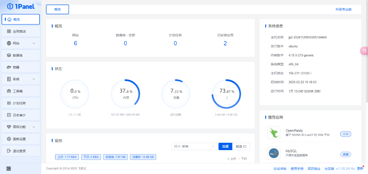 不过不管怎样,先装个面板吧,宝塔我装过显然不太合适,太占硬盘了,所以推荐1panel,正好