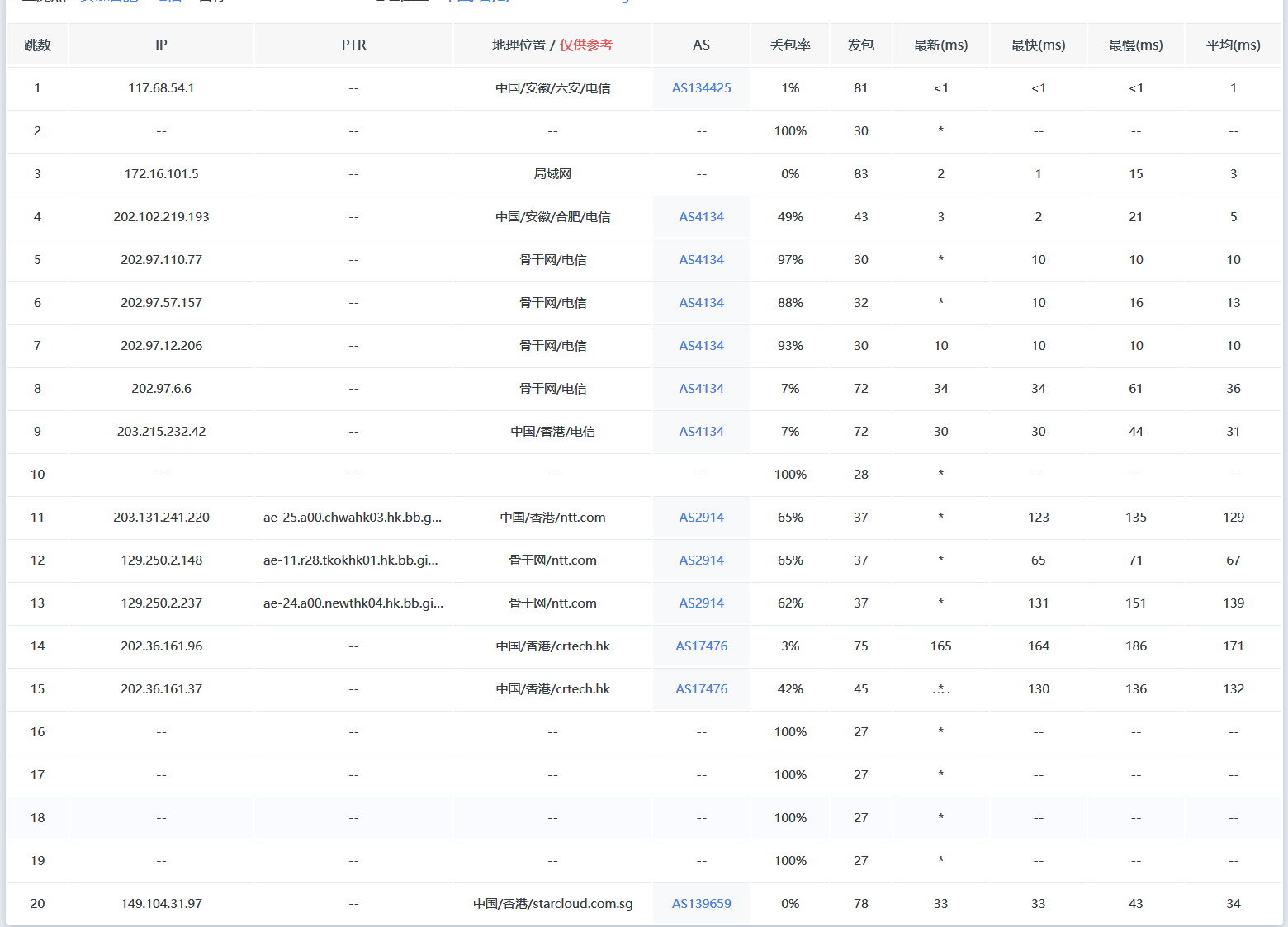 回程路由的话,这台机器比较神奇,首先先看电信是走的联通CUG入境后在国内继续走联通骨干网,直到在目的地附近才会转电信骨干网,相比走拥堵的电信169骨干网要好的多了,算是一个高性价比的优化方案。