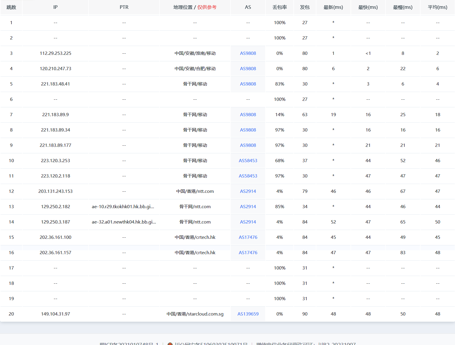 可以看到除了那个山东济南联通不知道为什么ping不通(也可能是它那边服务器挂了)。其他都是非常稳定的。移动稍微弱一点。