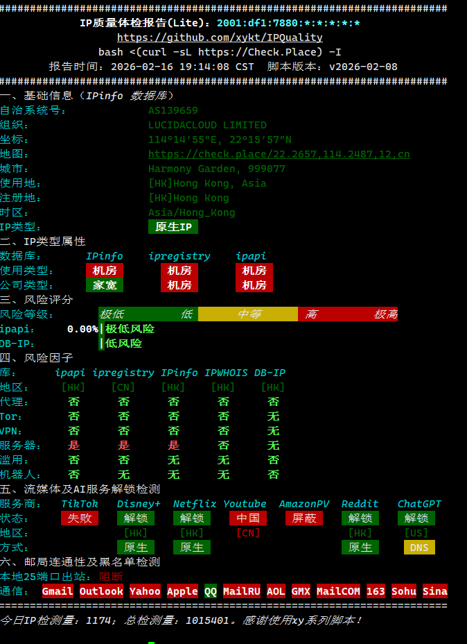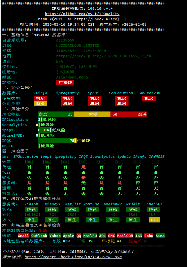 先检测下v4 可以看到首先是广播ip(这个不用说),风险评分除了ipqs报了一点可疑别的都是低风险。然后流媒体检测这块除了chatgpt是DNS解锁别的都是原生。25端口不开。