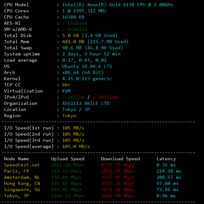 可以看到cpu是志强金牌6138,处理器缓存16M,这是个拼多多50块钱的垃圾u。内存512M,这么点内存不至于超开。KVM架构。这个不带ipv6,无所谓。硬盘是机械硬盘,可以满足frp需求。毕竟这个价格。测速还行,这几个都是国外的
