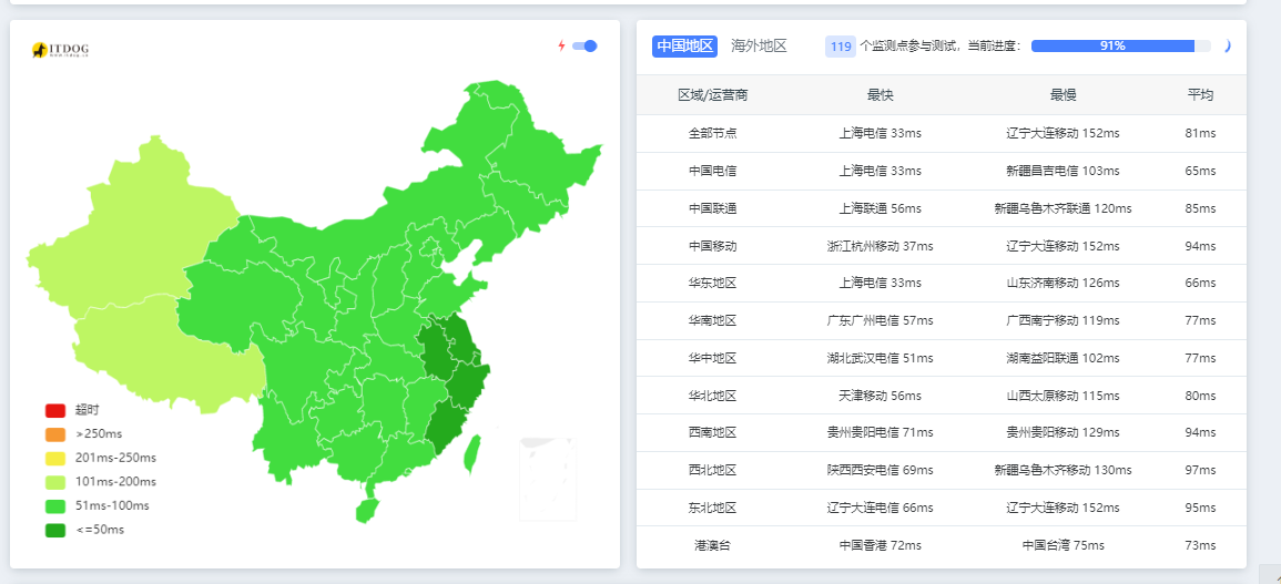 全国一片绿,就算西部也是100多,全国最慢的是152ms,IIJ还是很不错的。波动较小,稳定