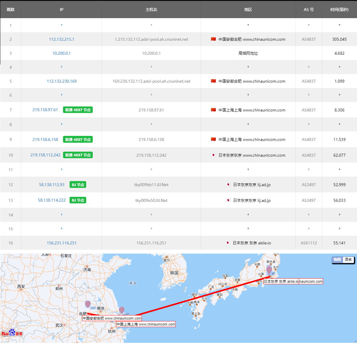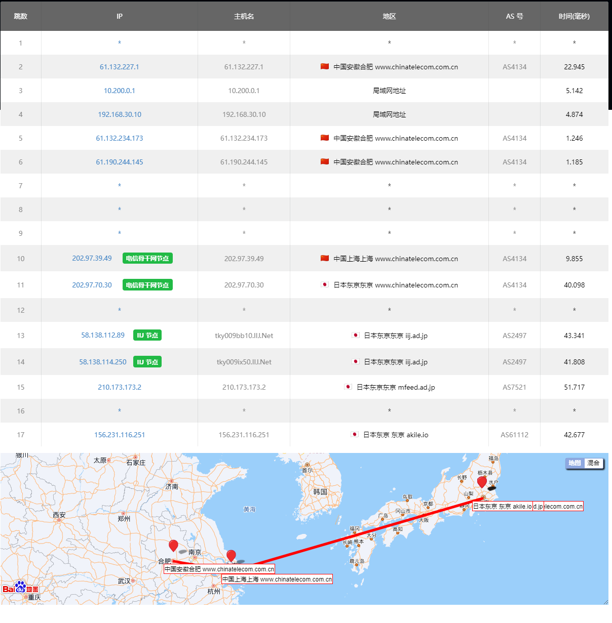 从合肥过去走骨干网传输,先到上海再出口,出口处切换IIJ线路