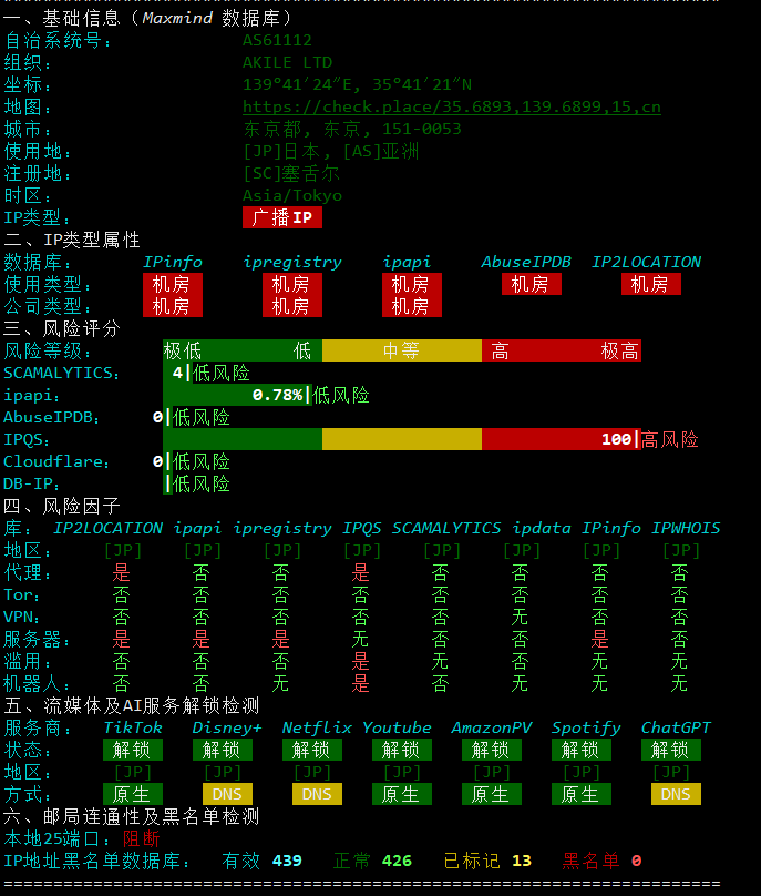 广播ip 也不是不能用。IPQS报了个100。。。这里的流媒体测试都可以,disney+ netflix chatgpt为akile的DNS解锁,其他原生。