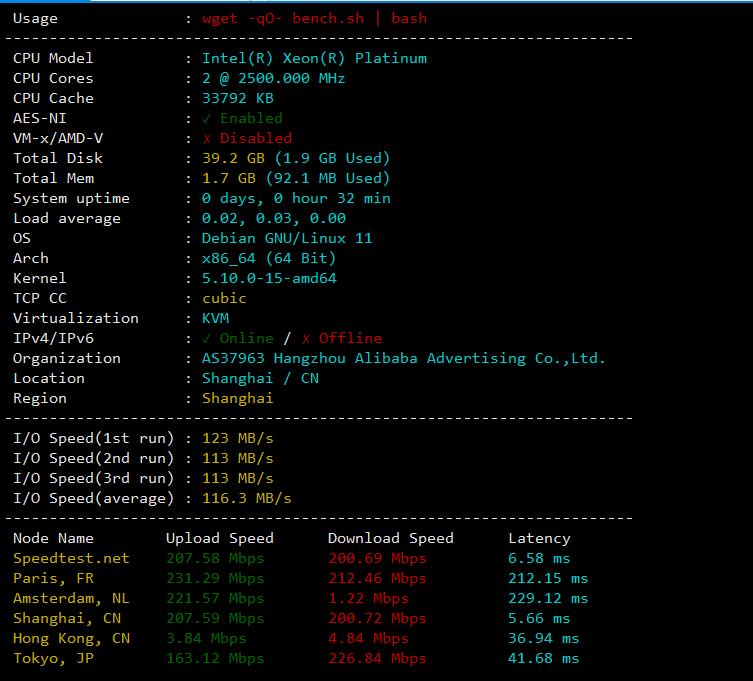 38/y阿里云2G2核200M上海机测评!最便宜的国内机