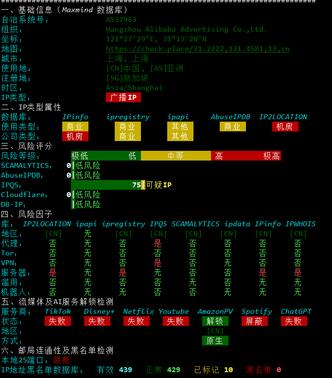 ip看着还算干净,25阻断,流媒体不用看了内地全解锁,海外肯定看不了
